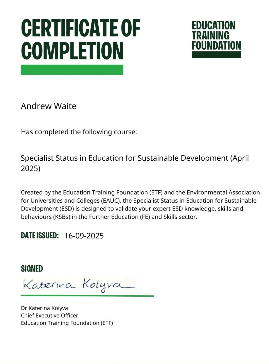 As an experiences Environmental Specialist, holding a Teaching Degree, this Specialism is an additional "Status Formation" to acknowledge the evidence based expertise in Sustainable Development.